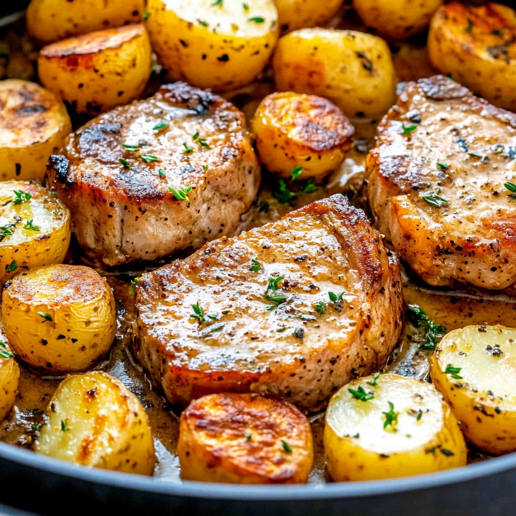 After searing the beef chops, remove them from the skillet temporarily. In the same pan, add your halved baby potatoes. Season them with salt, pepper, and garlic powder while they sauté in any leftover juices from the meat – this step infuses them with flavor!